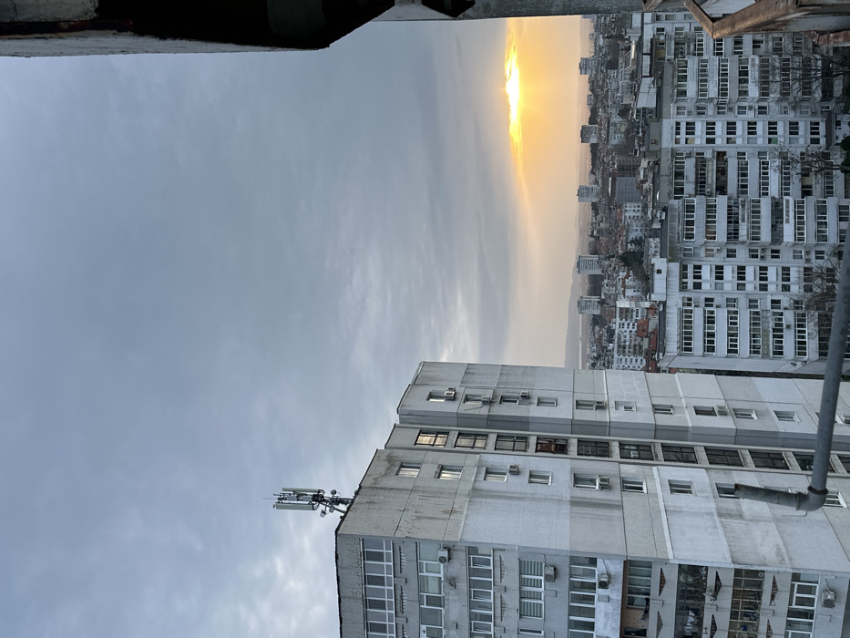 The image presents an elevated urban cityscape in Varna, Bulgaria, under a partially cloudy sky. In the immediate foreground, dark, rough concrete architectural elements frame the view from the upper right and lower right, with a horizontal metal pipe or railing visible in the lower center. A tall, multi-story, light-grey concrete residential building dominates the left side of the midground, extending nearly the full height of the frame. This building features multiple rows of rectangular windows, some with white frames, and numerous external air conditioning units affixed to its facades. A cellular telecommunications antenna tower, comprising several vertical masts and horizontal dishes, is mounted on the flat roof of this building. To the right of this structure, a second, similarly styled but shorter, multi-story residential building is visible, extending across the lower-middle section of the image. The background reveals a dense urban panorama stretching to the horizon, characterized by numerous multi-story residential buildings. The sky above is predominantly overcast with grey clouds. However, a distinct, bright horizontal band of yellow sunlight breaks through the clouds along the distant horizon, indicating a low sun position, likely sunrise or sunset. Faint outlines of distant landmasses or hills are visible beneath this illuminated sky band. No individuals, vehicles in motion, or discernible actions are present in the scene.
