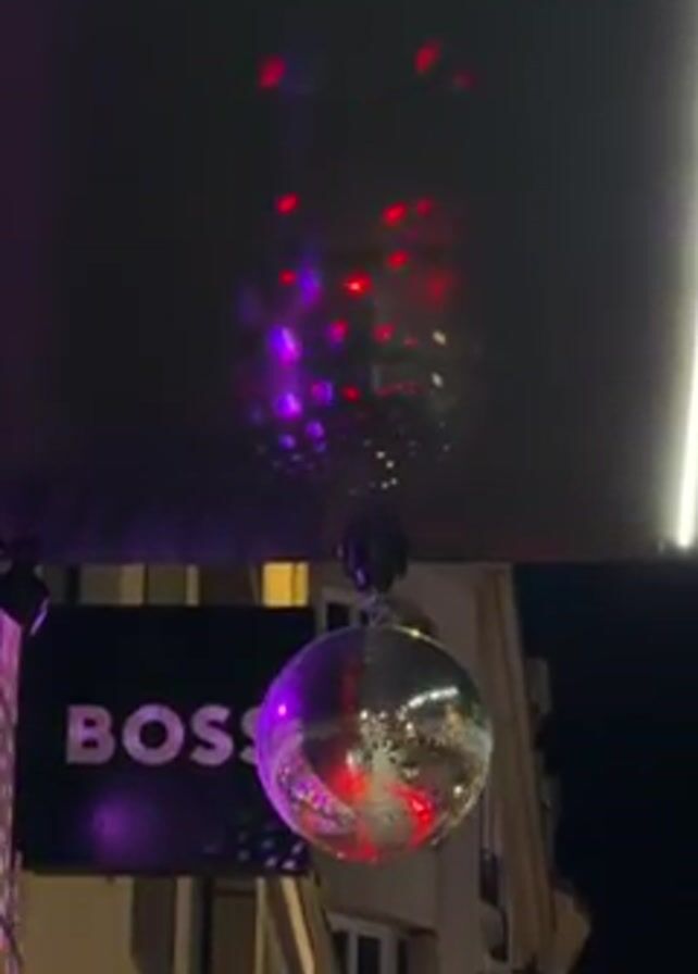 At night, a disco ball hangs beneath a dark awning. Above it, red and purple lights dance across the surface of the awning. Below, a sign for "BOSS" glows purple. The background consists of buildings lit by streetlights against the night sky.