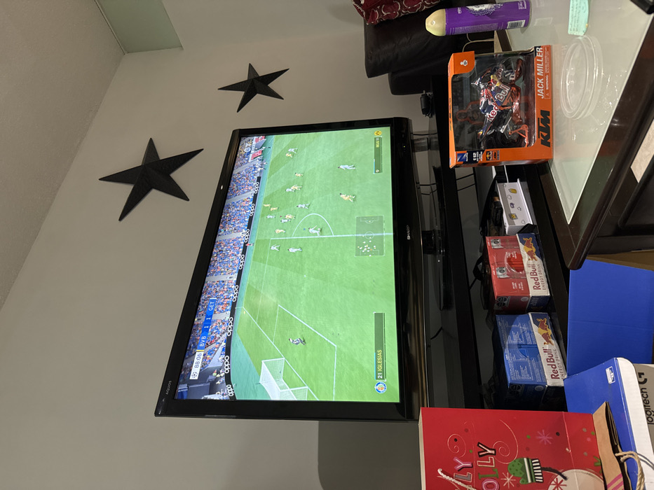 A flat-screen TV displays a soccer game, showing player formations on the green field