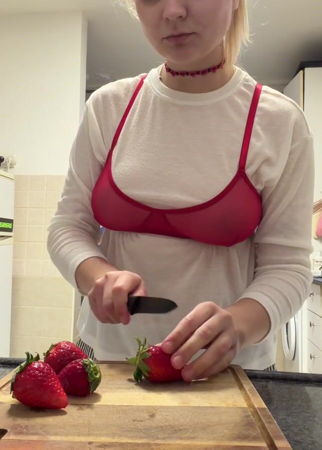 A young woman is cutting strawberries on a wooden cutting board. She is wearing a white long-sleeved shirt and a red sheer bra. She uses a small black knife to slice the strawberries. There are four strawberries on the cutting board. The setting appears to be a kitchen, with a white tiled wall and a SHURE-branded appliance visible in the background. The woman is focused on the task of cutting the strawberries. She is also wearing a red choker.