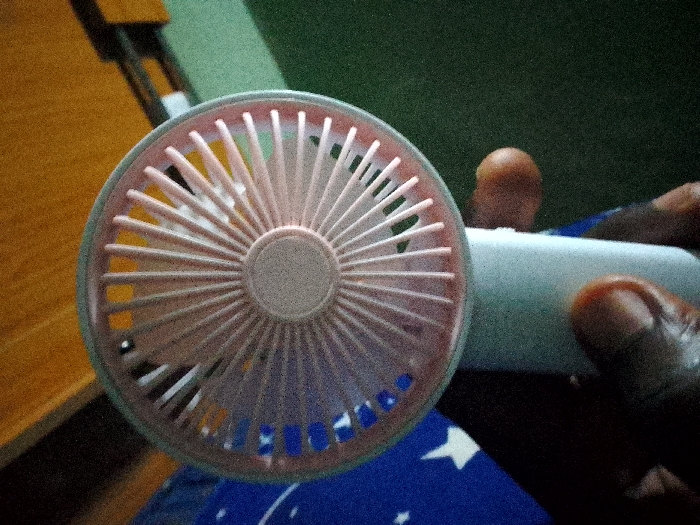 A handheld fan is held in someone's hand. The fan has a pink grill and a white handle. The grill features a circular design with evenly spaced bars radiating from a central hub. Blue fabric with white stars is visible in the lower portion. A wooden surface and a green wall appear blurred in the background, along with the hand.