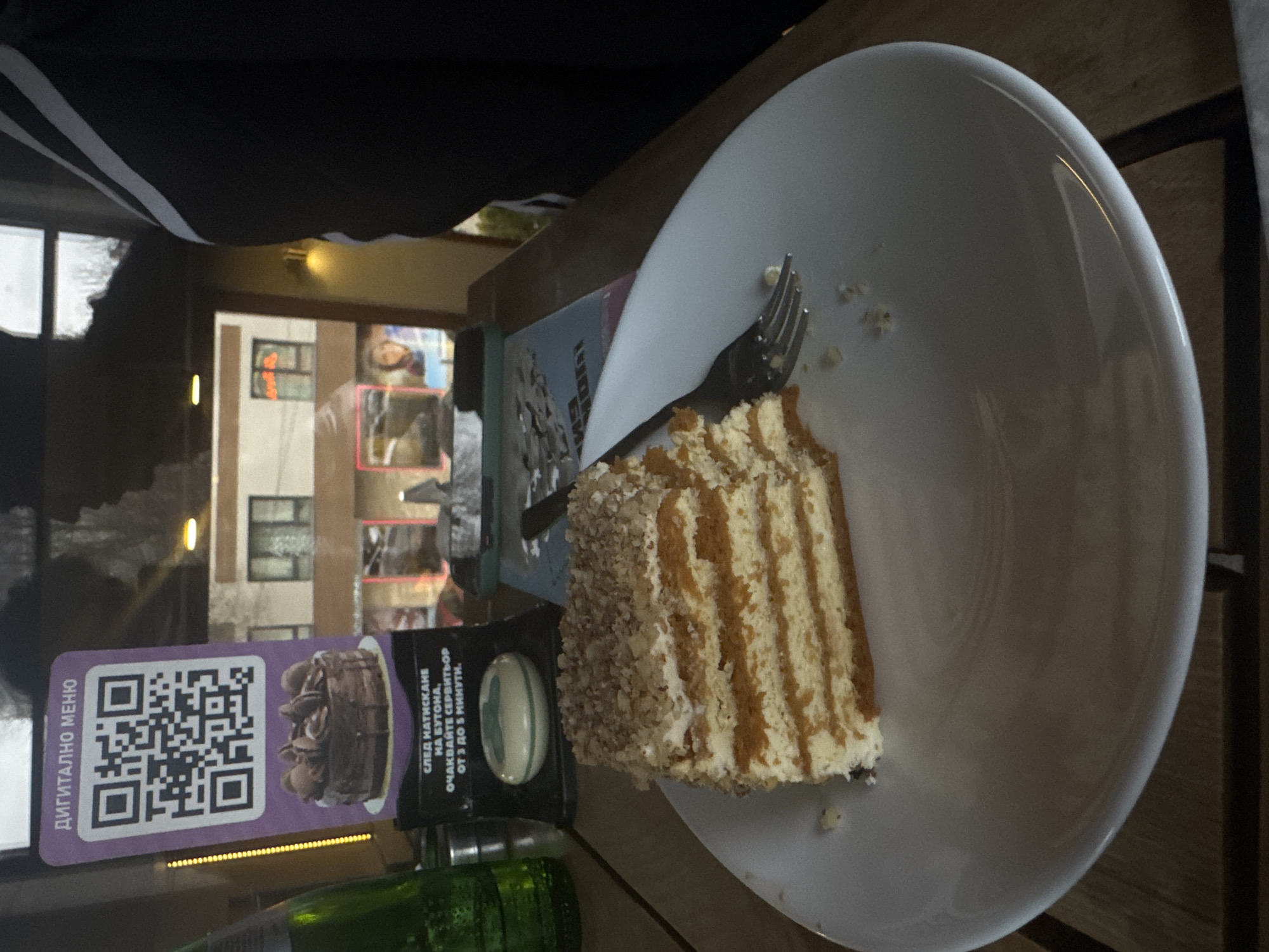Here's a detailed description of the image: **Scene:** The image shows a slice of cake on a white plate, a fork, a purple menu card with a QR code, a green bottle, and a book on a wooden table. Outside the window there is a view of buildings. **Objects:** * **Cake:** A layered cake with visible fillings, topped with nuts. * **Plate:** A white, round plate. * **Fork:** A metal fork placed near the cake. * **Menu Card:** A rectangular menu card with a QR code and a picture of a cake. Bulgarian text can be seen "ДИГИТАЛНО МЕНЮ СЛЕД НАТИСКАНЕ HA БУТОНА, ОЧАКВАЙТЕ СЕРВИТЬОР OT 3 ДО 5 МИНУТИ." which translates to "DIGITAL MENU AFTER PRESSING THE BUTTON, WAIT FOR A WAITER FROM 3 TO 5 MINUTES." * **Green Bottle:** A bottle with green liquid. * **Book:** A book is partially visible under the plate. **Environment:** * **Table:** A wooden table with dark brown accents. * **Background:** Through a window, buildings are visible. * **Interior:** Based on the presence of the menu card and cake, the scene appears to be inside a restaurant or cafe. * **Clothing:** In the upper left corner of the image part of a black and white striped top is visible. **Location:** * Sofia, Bulgaria is identified in the text in the images.