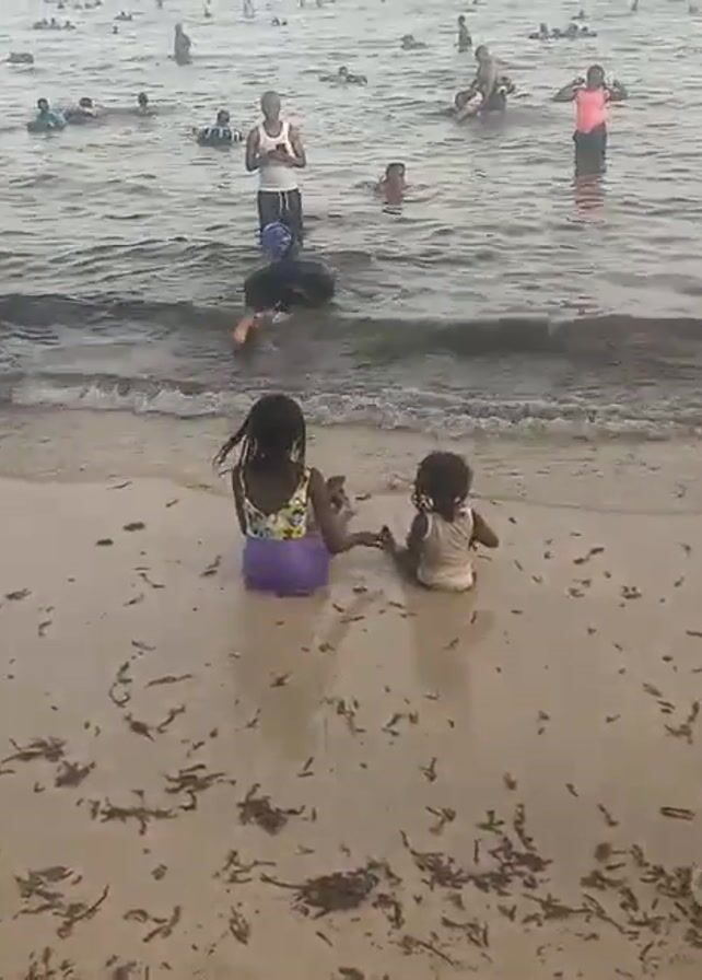 crowded beach scene with two young children, likely girls, sitting in the wet sand near the water's edge. They are facing the ocean, and there are many people swimming and standing in the water behind them. The girl on the left is wearing a floral top and purple shorts, while the other girl is wearing a white outfit. There are bits of seaweed scattered on the sand. A person walks past the children on the right side of the frame carrying a bag. The atmosphere seems relaxed, and people are enjoying the water.