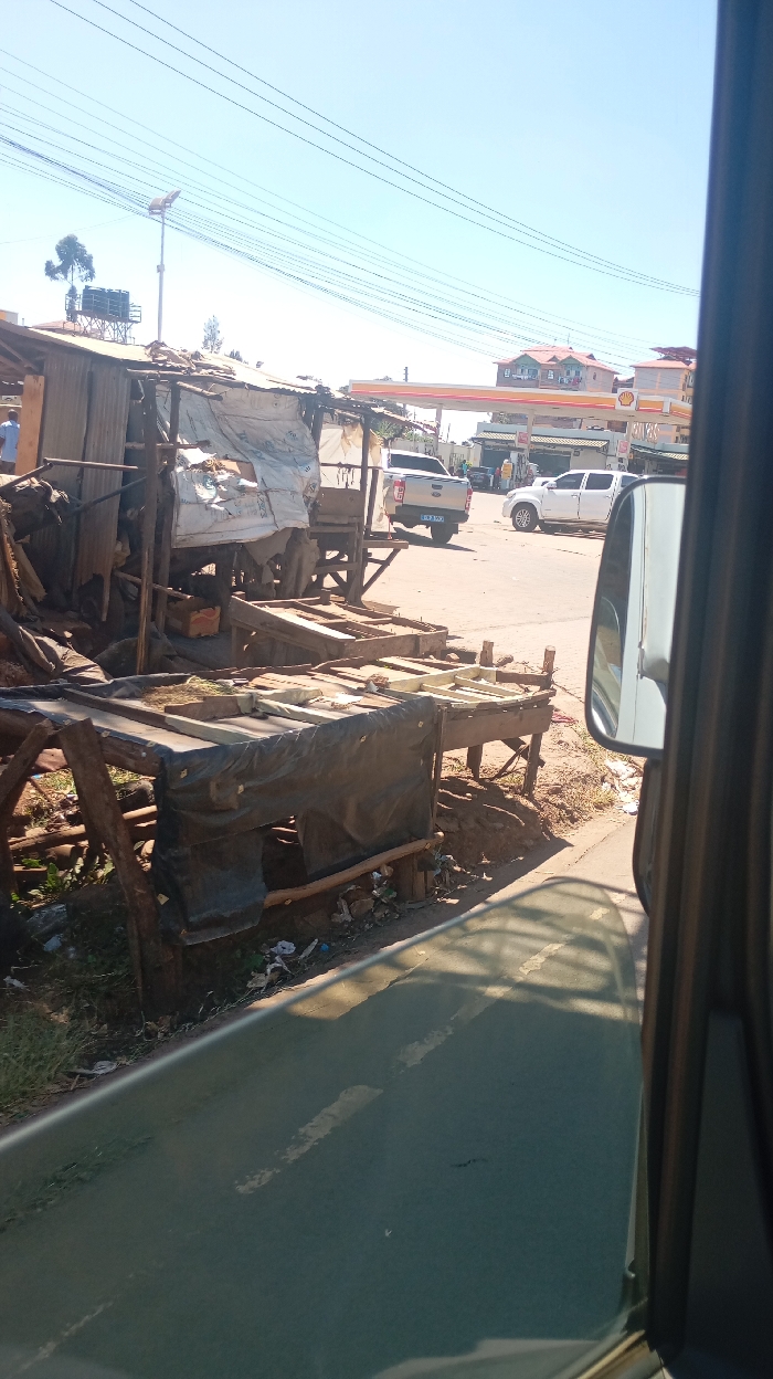 A makeshift market stall, constructed with wood and tarps, sits roadside. Debris litters the area beneath the stall. Behind it stands a shanty, possibly a shop or home. In the background, a Shell gas station is visible, with two white pickup trucks parked near it. Overhead, power lines crisscross the clear sky. The photo appears to be taken from a moving vehicle, with the rearview mirror and car frame visible on the right. The road appears to be asphalt with some weathering.