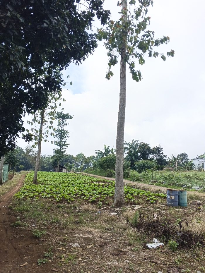 The scene depicts a rural agricultural area in Man Gyat, Myanmar, under an overcast sky. A dirt path runs from the lower-left foreground into the midground. The ground to the right of the path is covered with dry grass, weeds, and exposed soil, with a crumpled white object visible on the lower right. Two tall, slender trees with sparse green foliage stand prominently, one near the left edge and another more centrally located. In the midground, a large, rectangular field cultivated with numerous rows of vibrant green leafy plants, likely a vegetable crop, occupies the center. A second dirt path borders the right side of this cultivated field. To the right of the central tall tree, two industrial barrels, one blue and one green, rest on the ground. The background features dense vegetation, including various trees and what appear to be banana trees on the right. A small, simple wooden shed is visible behind the cultivated field, and a white building with a dark roof is partially visible on the far right horizon. No individuals are present in the scene.