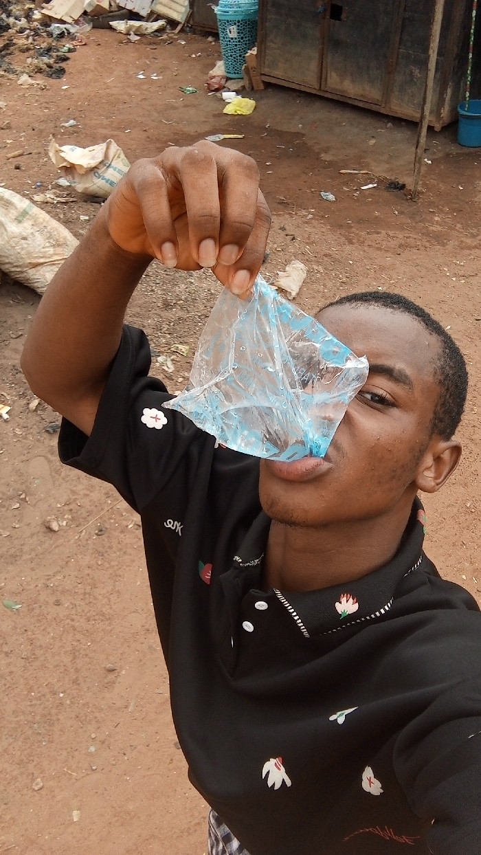 A young adult male, with dark skin and short dark hair, is positioned centrally, looking directly at the camera. He wears a black short-sleeved polo shirt adorned with small, multi-colored embroidered motifs, including white, red, and green stylized floral shapes. The shirt features a collar with white buttons and a white dotted trim. He is holding a clear plastic sachet, containing liquid with visible condensation and light blue markings, to his mouth with his right hand, from which he appears to be drinking. The scene is an unpaved outdoor area in Onitsha, Nigeria, characterized by reddish-brown dirt ground. The ground surface is uneven and littered with various forms of refuse, including scattered cardboard fragments, plastic bags (one yellow), and other general debris. In the mid-ground to the left, a large, light-colored sack rests on the ground. The background features a light blue patterned plastic container and a dark-colored, multi-compartment metal kiosk. A smaller blue bucket is visible to the right of the kiosk, and a thin vertical pole stands in the mid-ground.