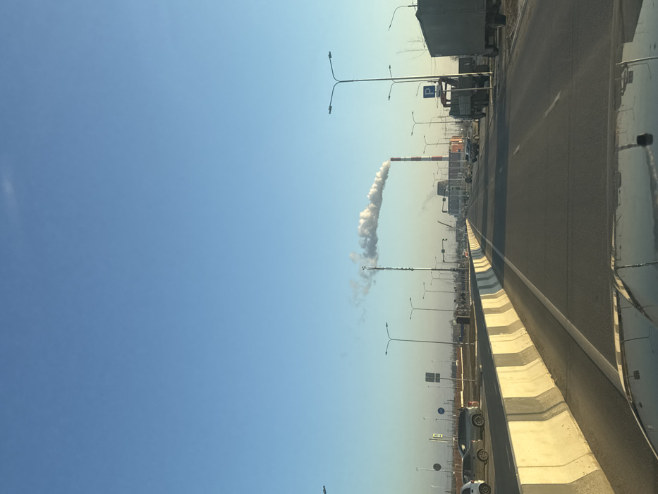 The image depicts a multi-lane asphalt road leading towards the industrial area of the Rostov Thermal Power Plant (Rostovskaya TPP) in Rostov-on-Don, Russia. The perspective is from inside a vehicle, looking forward. The sky is clear and light blue, occupying the upper two-thirds of the frame. In the distance, a tall, red and white striped industrial smokestack is visible, emitting a large plume of white smoke horizontally towards the right. To the left of this main smokestack, a slender antenna tower is also visible, emitting a smaller, wispy plume of smoke or steam near its base, which merges with the larger plume. Various industrial buildings and structures, including what appears to be a large, dark-colored crane, are present in the mid-ground, forming part of the power plant complex. The road features a concrete Jersey barrier running along the left side, separating the visible lanes from an adjacent area. On the paved area beyond the barrier, several parked vehicles, including light-colored SUVs and sedans, are visible. Further to the left, the land appears flat and undeveloped. On the right side of the road, a dirt or gravel shoulder is visible, where a dark-colored flatbed truck with a small crane attachment is parked, along with a larger, light-colored box truck. Numerous streetlights with double arms line both sides of the road, extending into the distance. A blue "P" parking sign on a pole is visible on the right shoulder. Several vehicles are present on the road in the distance, appearing to be in motion. The overall lighting suggests either early morning or late afternoon, with a low sun illuminating the scene. The reflection of a vehicle's dashboard or hood is visible in the lower portion of the image.