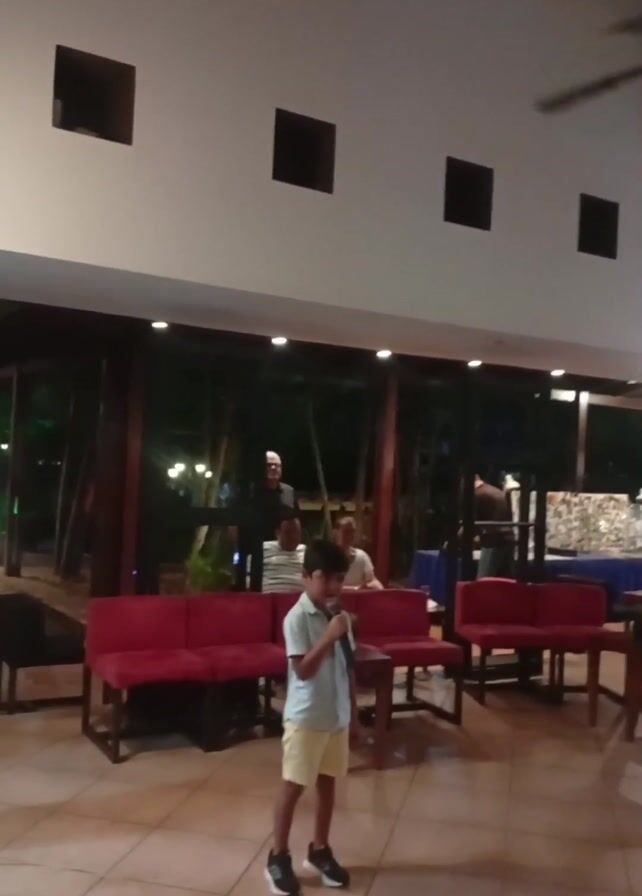 A young boy is singing into a microphone while standing in a tiled area, likely an outdoor or semi-outdoor setting, given the visible vegetation and posts surrounding the space. He is wearing a light blue button-up shirt, yellow shorts, and black sneakers. Behind him, a group of seated adults is observing, and one man is making a hand gesture, perhaps related to the performance. The area is furnished with red benches and small tables, and the architecture includes square-shaped recessed lighting fixtures in the ceiling. The overall ambiance suggests a casual, perhaps family-oriented, event.