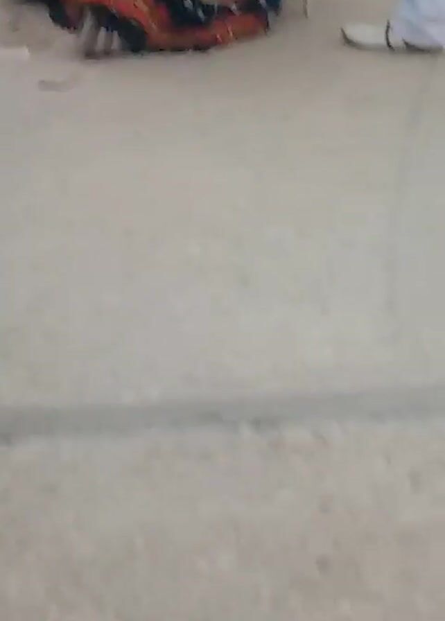 A person wearing a colorful masquerade costume with a white mask and black dots dances to the rhythm of a musical instrument. The costume includes black and yellow fur, red and gray fabric layers, and patterns. The person is surrounded by other people, some wearing white clothing and shoes. The scene takes place on a light-colored, concrete surface. The quality of the video is somewhat blurry. The logo for "TECNO SPARK" is visible at the bottom of the frame.