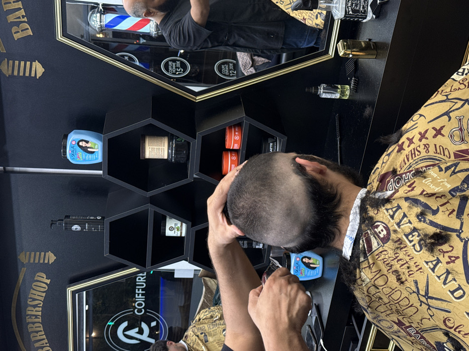 The image displays an interior scene from a barbershop in Strasbourg, France