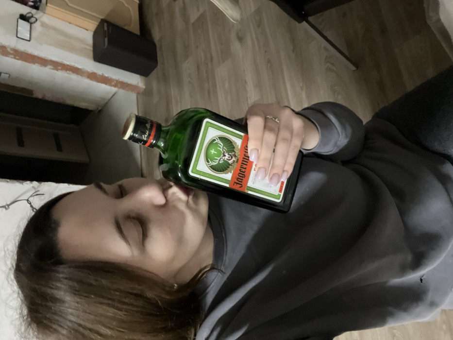 The scene is set indoors, within the city of Leninakan, Russia. A female individual, with brown hair, is shown from the upper chest, wearing a dark grey long-sleeved top. Her eyes are closed, and her lips are pursed in a kissing gesture directed towards a green glass bottle of Jägermeister. She holds the bottle in her right hand; a ring is visible on her right ring finger, and her nails are manicured with a light pink or nude polish. The Jägermeister label, featuring the brand's stag logo, is clearly visible on the bottle. The background consists of light-colored walls, which exhibit patches of exposed brick or rough plaster and visible wiring, suggesting an unfinished or utilitarian aesthetic. The floor is covered with light brown laminate. Two doorways are partially visible in the mid-to-far background, along with a dark rectangular object and a portion of a light-colored cabinet.