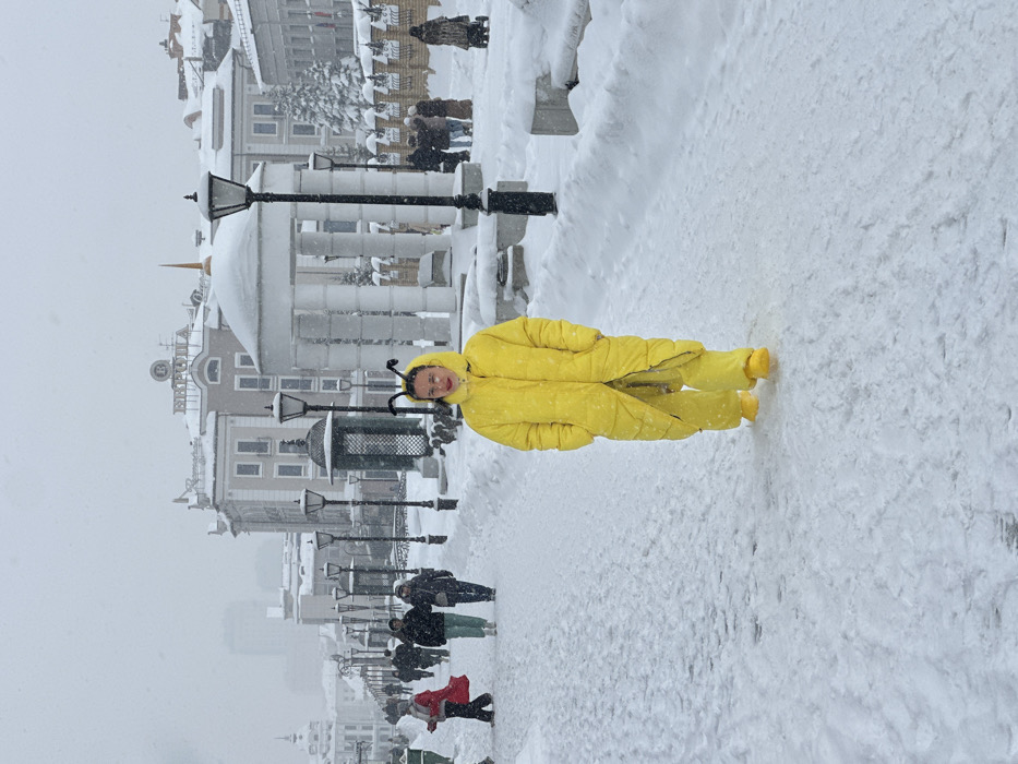 This image depicts a snowy urban street scene on Bauman Street in Kazan, Russia, specifically identifiable by the "ЕВРОПА" (Europa) hotel sign on a prominent building in the background. The environment is characterized by heavy snowfall, with snow uniformly covering the ground, building roofs, and horizontal surfaces. Light snow is actively falling, visible as small white specks against the darker background elements. The sky is overcast and white-grey. In the foreground, a single individual, appearing female, is centered, walking directly towards the viewer. This person is dressed in a bright yellow, full-body padded snowsuit with a hood, and matching yellow boots. A black headband with two short, flexible, black antenna-like protrusions is worn on the head. The individual's face is visible, showing a neutral expression and red lipstick, with hands in the suit's pockets. In the mid-ground and background, the street continues into the distance, lined with multiple black, ornate lampposts. To the left, several indistinct figures are walking along a snow-covered path, one wearing a noticeable red coat. To the right, a large, white, open-sided circular gazebo-like structure with pillars stands, heavily laden with snow. Further back, multi-story buildings with varied architectural styles line the street; the Europa Hotel building, light in color with an ornate facade, is most prominent.