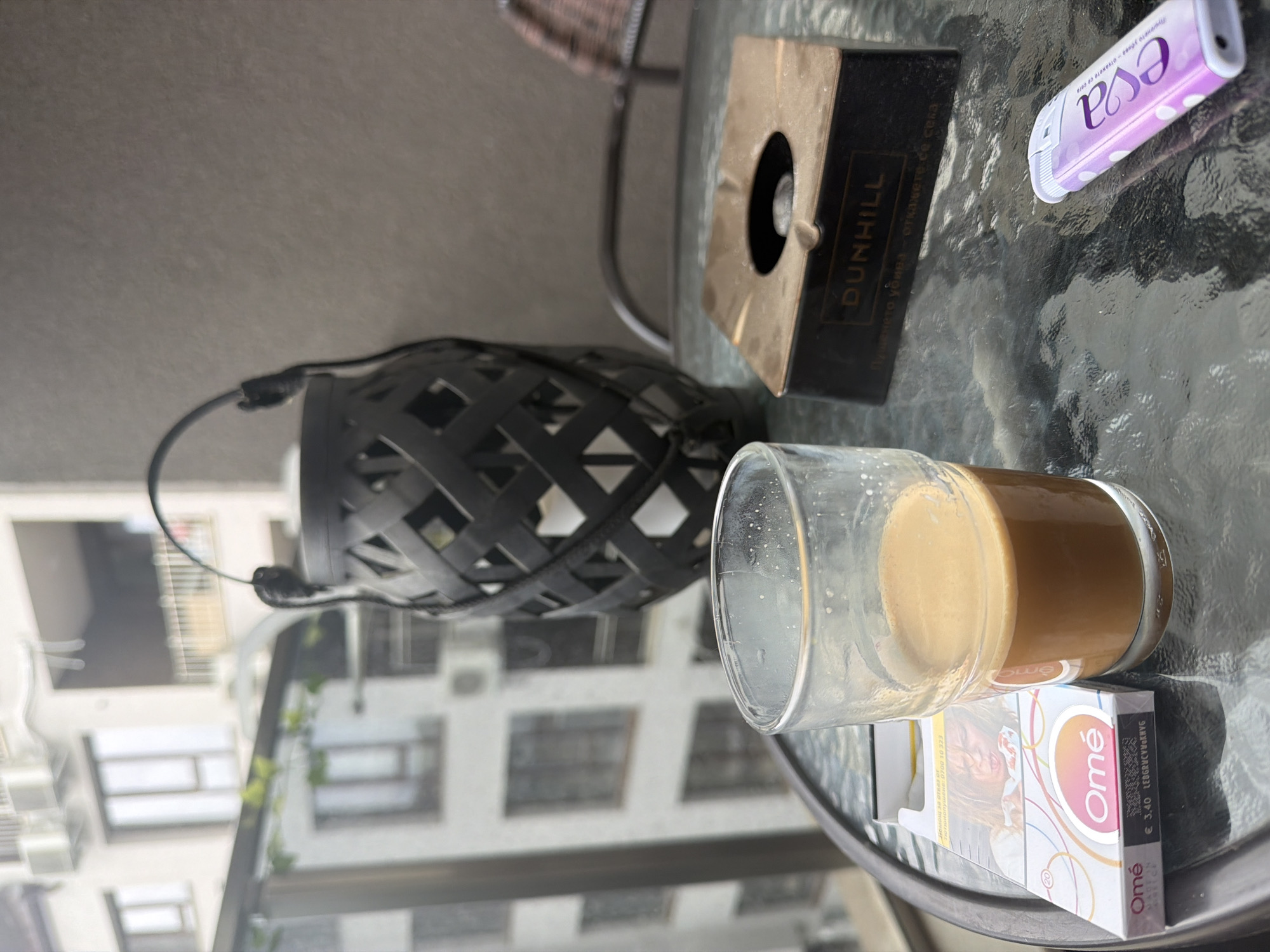 The image displays a close-up, elevated perspective of items resting on a ribbed glass table, likely on a balcony overlooking an urban residential area in Sofia, Bulgaria. On the table, from left to right, are: an open pack of "Omé" cigarettes displaying a graphic health warning, "Made in Greece" text, and a price of "€ 3.40"; a transparent glass containing a light brown beverage with foam (consistent with espresso); a black and bronze "DUNHILL" branded ashtray featuring Cyrillic text, partially visible as "Пушенето убива" (Smoking kills), indicating a Bulgarian health warning; and a purple lighter with white polka dots, branded "Eva" in Cyrillic script. Behind these items, a black woven lantern with a handle, containing a white candle, is visible. The background consists of blurred, light-colored multi-story apartment buildings with numerous windows and exterior air conditioning units, typical of an urban environment. A glimpse of a metal railing and green foliage is also present, suggesting a balcony setting. The Cyrillic script and specific Bulgarian health warning on the ashtray definitively place the scene in Bulgaria, with the urban architecture consistent with Sofia.
