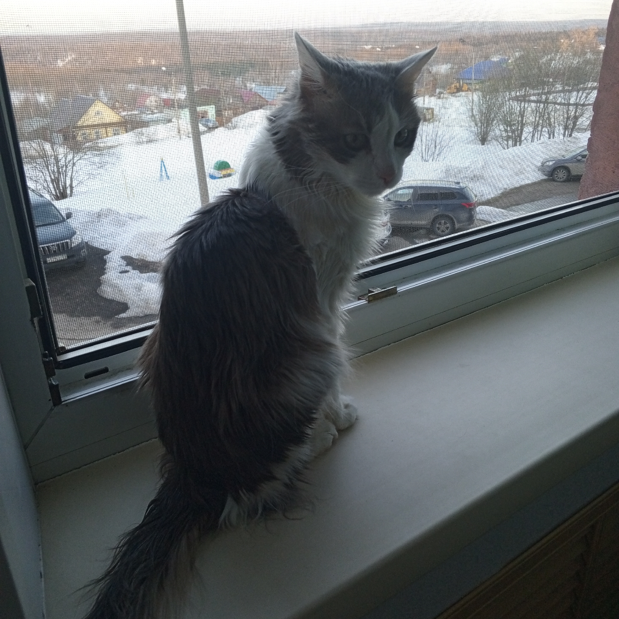 A gray and white cat is sitting on a windowsill, looking slightly down and to the right. The window has a screen, and through it, a winter scene in Gremyachinsk, Russia is visible. There is snow on the ground, with houses, trees, and parked cars in the background. A small playground can be seen to the left of the window, with blue playground apparatuses.