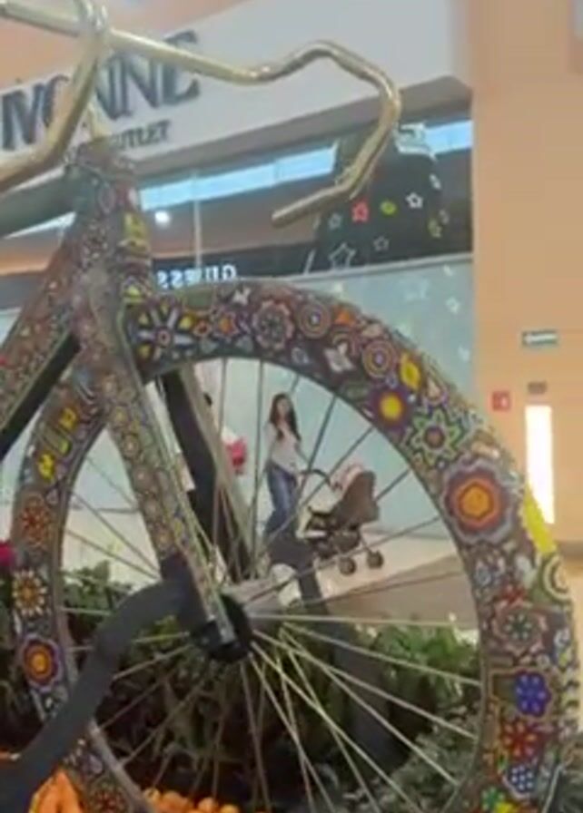 large bicycle decorated with colorful patterns that are reminiscent of Huichol artwork. The bicycle appears to be made of metal and the frame, wheels, and other parts are covered in vibrant designs. It is displayed indoors in a shopping mall. In the background, pedestrians walk by storefronts such as "IVONNE FACTORY OUTLET". The base of the bicycle display is surrounded by small orange pumpkins and red flowers. The lighting is bright and artificial.