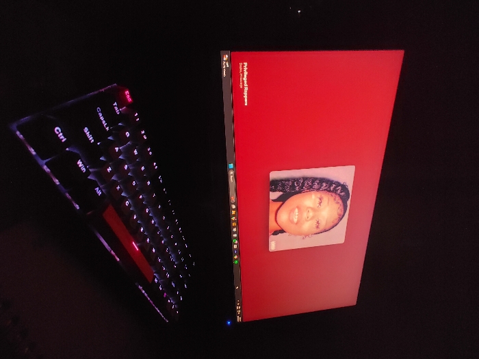 An illuminated keyboard sits to the left of a computer monitor, both on a dark surface. The keyboard's keys glow with various colors, mostly purple and white, highlighting key labels. The monitor displays a red screen with a portrait of a woman and the title "Privileged Rappers." The screen is slightly tilted away from the viewer, obscuring some of the screen's contents.