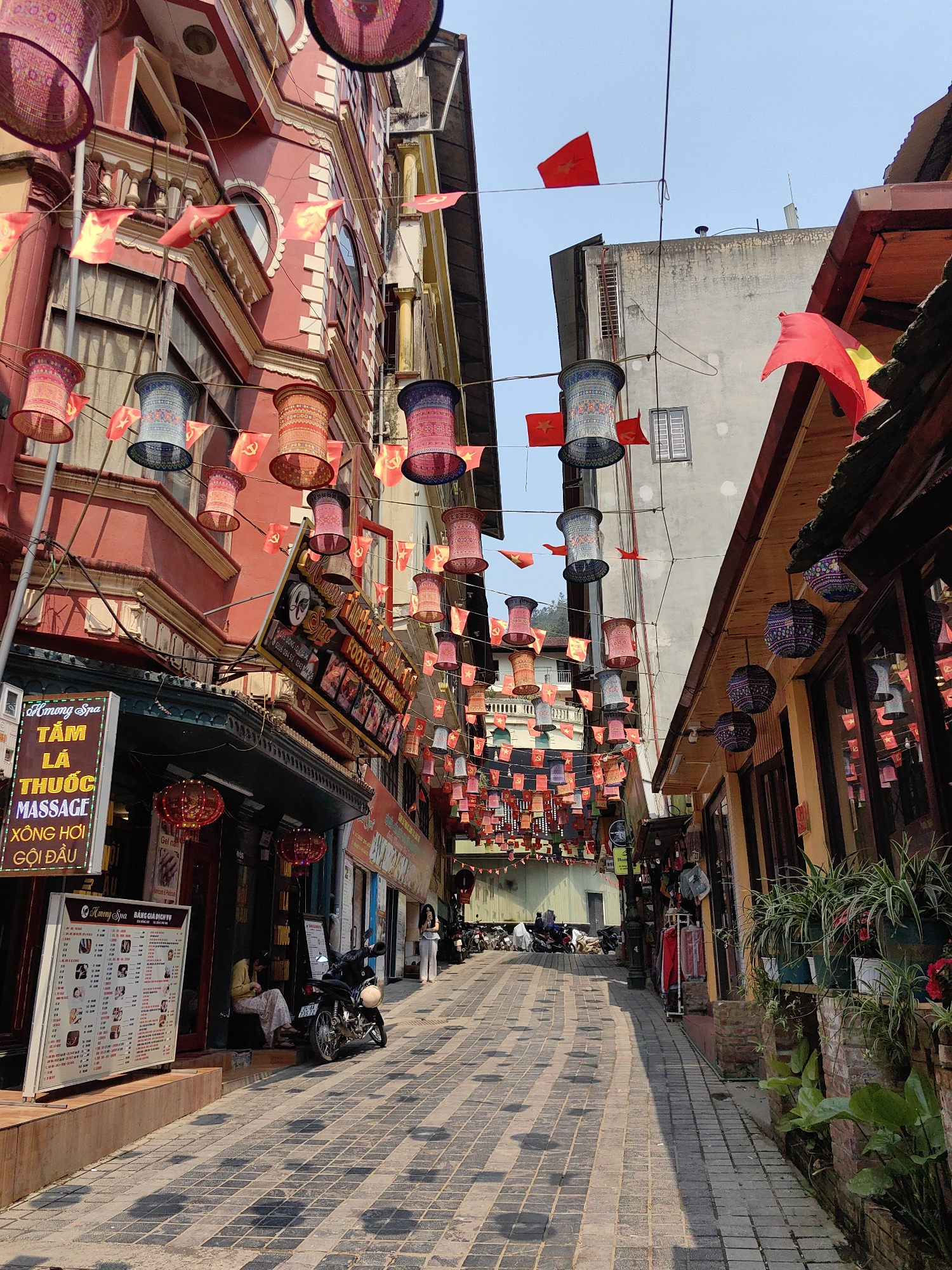 The image depicts a narrow pedestrian street in Sa Pa, Vietnam, lined with multi-story buildings under a clear blue sky