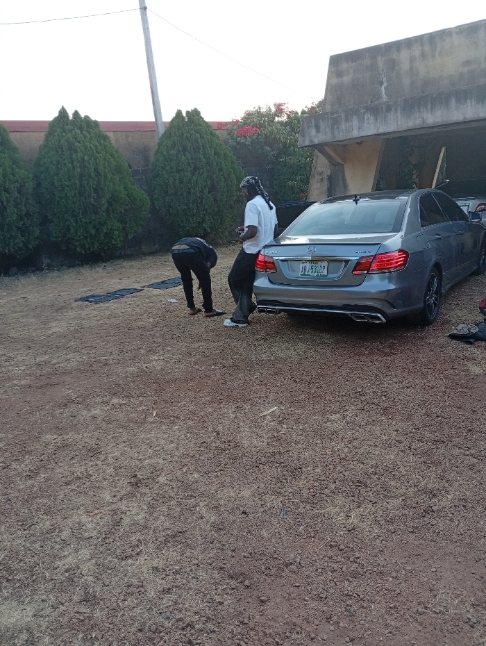 The image depicts an outdoor scene under clear daylight, set within what appears to be a private compound or vehicle yard. The ground is composed of reddish-brown dirt and gravel, interspersed with sparse dry vegetation. In the background, a low wall fronts a row of several tall, conical evergreen trees, with red-flowering bougainvillea visible beyond. A concrete architectural structure is partially observed on the upper right. Two adult males are present. One male, wearing a white short-sleeved shirt, dark trousers, and a dark head covering with visible dreadlocks, stands leaning against the rear of a grey Mercedes-Benz E-Class sedan. He holds a dark object, consistent with a mobile phone, in his left hand. The second male, dressed in dark long-sleeved attire and dark trousers, is bent at the waist with his back to the camera, attending to an area on the ground near two dark, rectangular objects. The grey Mercedes-Benz sedan, an E-Class model featuring quad exhaust tips and dark alloy wheels, displays a Nigerian license plate: "ABJ-53JP", indicating registration in Abuja, Federal Capital Territory. A dark bag or piece of clothing rests on the ground near the vehicle's rear right tire. The specific location within Jos, Nigeria, where this image was captured cannot be precisely identified from the visual information provided.
