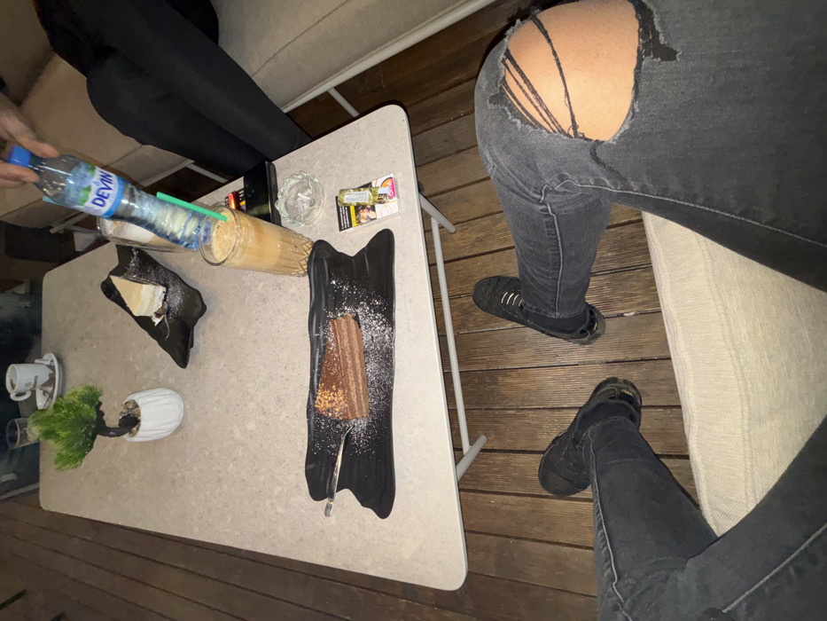 The image depicts a social gathering at what appears to be a cafe or restaurant, viewed from a first-person perspective. The specific location within the city of Sevlievo, Bulgaria, is not discernible from the visual information provided. In the foreground, the legs of the individual taking the photograph are visible, clad in dark, ripped jeans exposing the right knee, and dark sneakers, resting on a light-colored upholstered bench. Opposite, a second individual's legs, also in dark jeans and dark sneakers, are visible, seated on a similar upholstered surface. To the right, a third person's hand is seen holding a plastic bottle of "DEVIN" brand mineral water. A fourth person's arm and a white coffee cup are partially visible in the blurred background. The central focus is a light gray rectangular table laden with various items. Two slices of cake are presented on black, irregularly shaped plates: a multi-layered chocolate cake dusted with powdered sugar and nuts, accompanied by a fork, and a slice of lighter-colored cheesecake, also dusted with powdered sugar. Beverages include a tall glass containing an iced, light brown drink with a green straw, and a white ceramic coffee cup with a saucer. Other objects on the table include a small artificial bonsai tree in a white pot, a clear glass ashtray, a pack of cigarettes displaying Bulgarian health warnings, and a black smartphone. The floor beneath the table is constructed of wooden planks.
