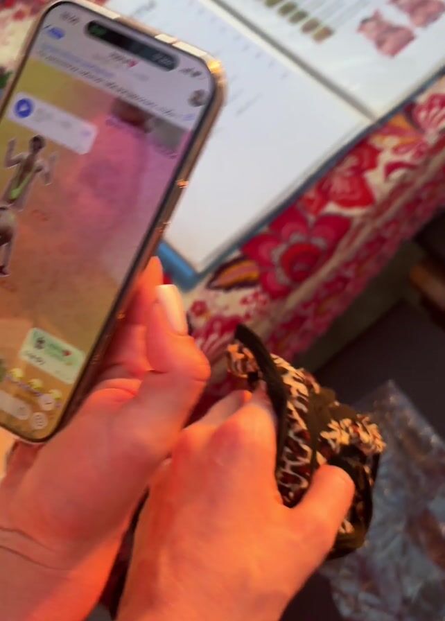 A person is at a restaurant table. They are holding a cell phone that is displaying a Telegram chat. The person then picks up a black and brown leopard-print bikini top with tie strings. The table is covered with a red and white patterned tablecloth, menus, condiments, and a drink.