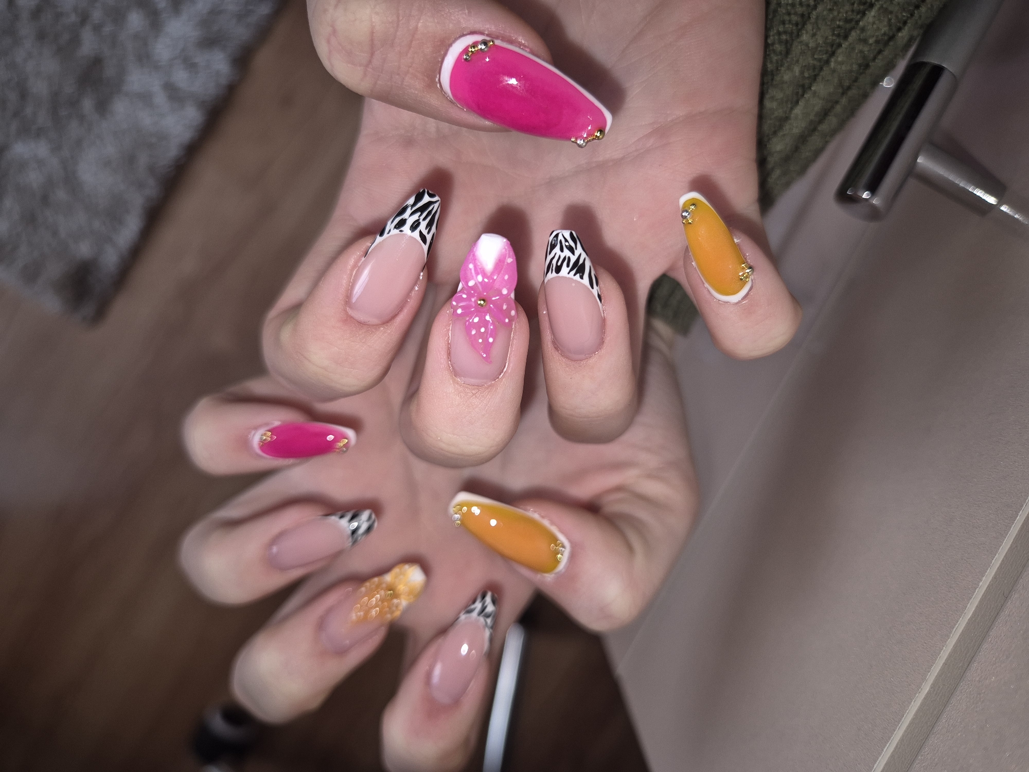 The image displays a close-up of two manicured hands in Pavlikeni, Bulgaria, showcasing an array of elaborate nail designs. Both hands feature long, pointed acrylic nails. On the hand positioned to the right of the frame (likely the wearer's left hand): - The thumb nail is solid orange with a white French tip line, embellished with several small gold studs along the cuticle and tip. - The index finger nail features a classic French tip with a black and white zebra stripe pattern on the white tip. - The middle finger nail is entirely hot pink, adorned with small gold studs near the cuticle and tip. - The ring finger nail exhibits a French tip with a black and white zebra stripe pattern. - The pinky finger nail is solid hot pink with small gold studs near the cuticle. On the hand positioned to the left of the frame (likely the wearer's right hand): - The thumb nail is solid orange with a white French tip line, embellished with small gold studs near the cuticle and tip. - The index finger nail features a French tip with a black and white zebra stripe pattern. - The middle finger nail is a light pink base with a 3D pink bow appliqué, accented with white polka dots and a central gold stud. - The ring finger nail combines a gold glitter design on the nail bed with a French tip incorporating a black and white zebra stripe pattern. - The pinky finger nail displays a French tip with a black and white zebra stripe pattern. The background consists of a wooden floor on the upper left, transitioning to a grey shaggy rug on the upper right. In the foreground, a light-colored, possibly beige or light grey, flat surface is visible, along with a portion of a silver metallic handle, suggestive of a drawer pull or cabinet handle. No explicit actions or interactions are depicted beyond the presentation of the hands.
