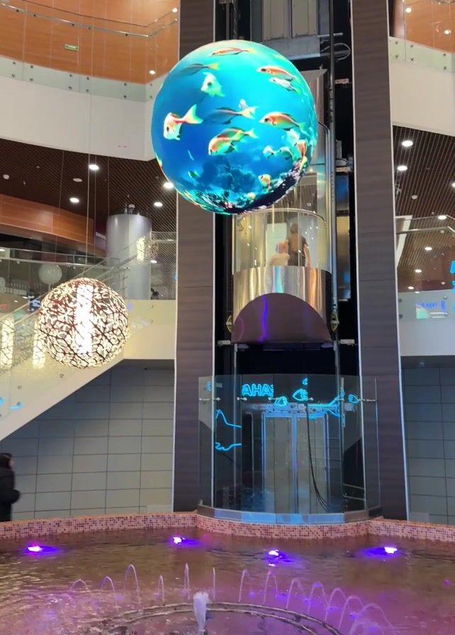 The interior of a modern shopping mall is displayed. At the center is a round fountain illuminated with purple lights, with small jets of water spraying upwards. Above the fountain is a cylindrical glass elevator, with people inside moving upwards. Beside the elevator is a large spherical LED display showing a scene of fish swimming underwater. The mall has multiple levels, with glass railings lining the staircases. Several decorative light fixtures hang from the ceiling. Two individuals are standing on a higher level of the mall, conversing. The color palette consists of blues, browns, and whites, creating a clean and contemporary ambiance.
