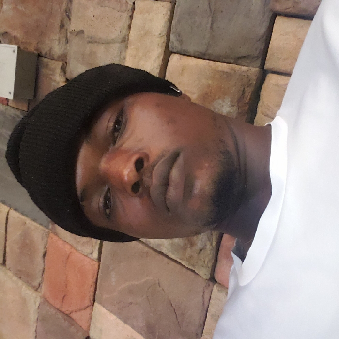 An adult male is depicted in a medium close-up, gazing directly at the camera. He has dark skin, short facial hair on his chin and jawline, and wears a black knit beanie and a white crew-neck t-shirt. A silver-colored stud earring is present in his left ear. The background features a textured wall composed of irregularly shaped, multi-toned stone or tile blocks in shades of brown, tan, and gray. In the upper right portion of the background, a light-colored rectangular utility box is mounted on the wall. The specific location within Asaba, Nigeria, is not discernible from the visual information provided.