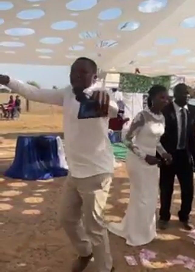 man dancing enthusiastically in the foreground, dressed in a white shirt and beige pants. He's holding a phone in his left hand and gestures with his right. Behind him, a bride in a white wedding dress stands with a man in a black suit. They are also dancing, but more subdued than the man in the foreground. There's a white canopy above with round cutouts, creating a dotted pattern. On the ground, there are scattered bills of money. In the background, there is a motorcycle and a glimpse of trees and open land.