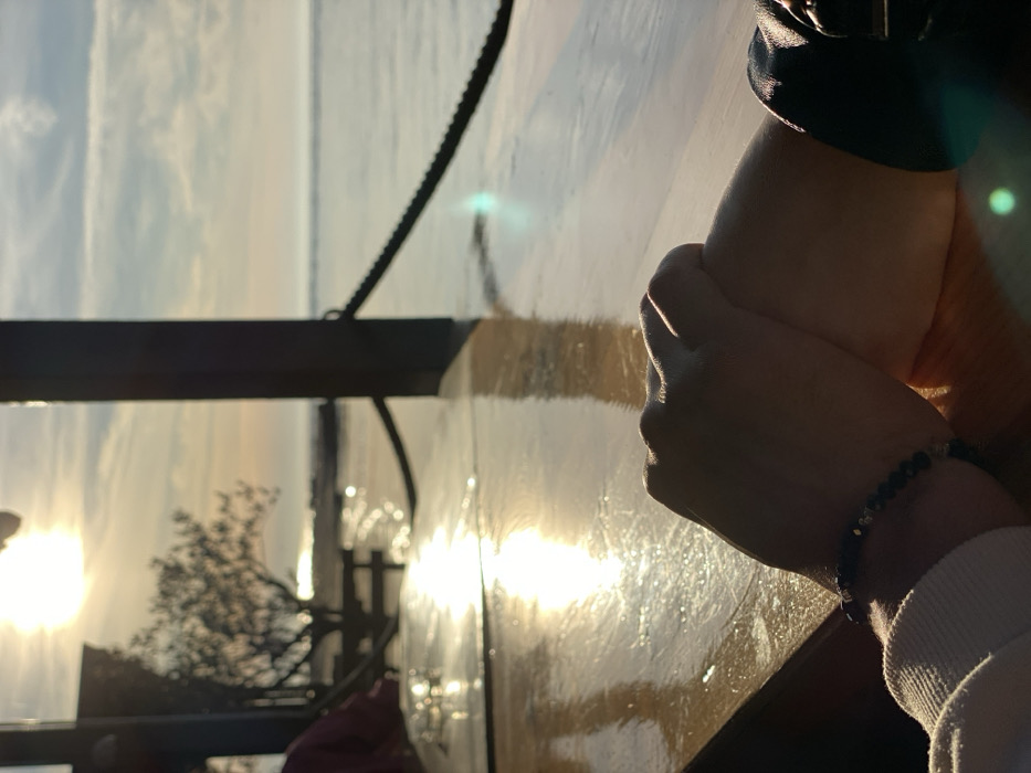 A close-up, tilted shot captures hands resting on a reflective surface. A bracelet adorns one wrist. In the background, a railing and chain are visible, with the setting sun and trees creating a hazy, golden glow. Light reflects intensely off the surface, blurring details and adding a dreamlike quality to the scene. The focus is on the hands, conveying a sense of quiet contemplation.