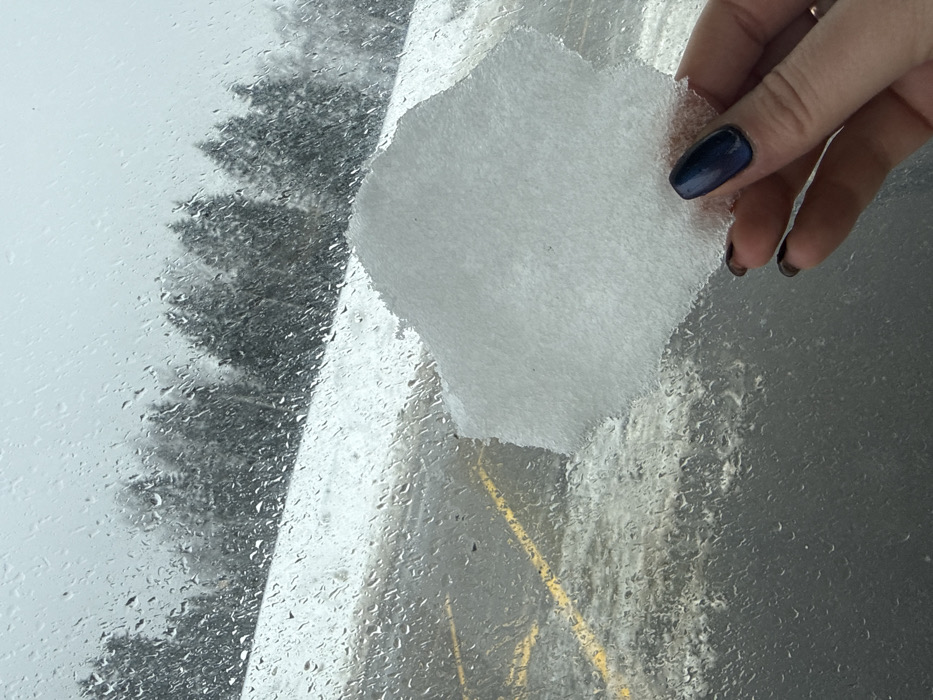 The image depicts an exterior winter scene viewed from inside a vehicle through a rain-streaked window, located in the city of Ромашка Нп, Russia. A human hand, featuring dark blue polished fingernails, is positioned on the right side of the frame, holding a flat, irregularly shaped piece of white snow or compressed ice. Outside the window, an asphalt surface is visible, partially covered by snow and ice, with discernible yellow painted lines suggesting a parking area or roadway. A significant accumulation of snow is present on the ground, particularly along the right side, forming a snowdrift. In the background, a row of snow-covered evergreen trees stands beneath an overcast sky. The scene indicates cold, wet weather conditions with precipitation contributing to the water droplets on the window.