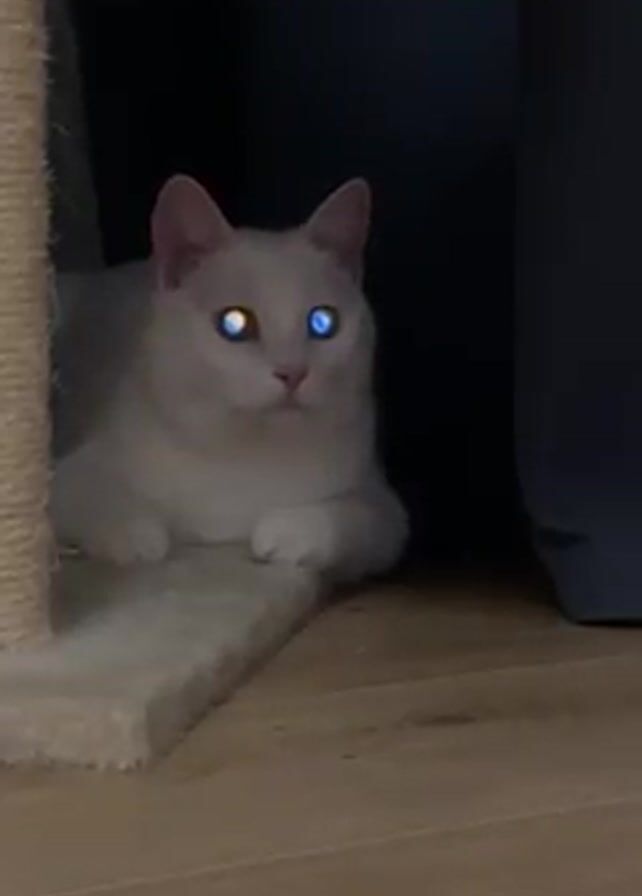 - "A still, eye-level shot depicts a white cat with heterochromia (one blue and one red eye) sitting on a wooden floor next to a carpeted scratching post and a dark blue curtain" by FM-PFEbq2, licensed under CC BY 4.0