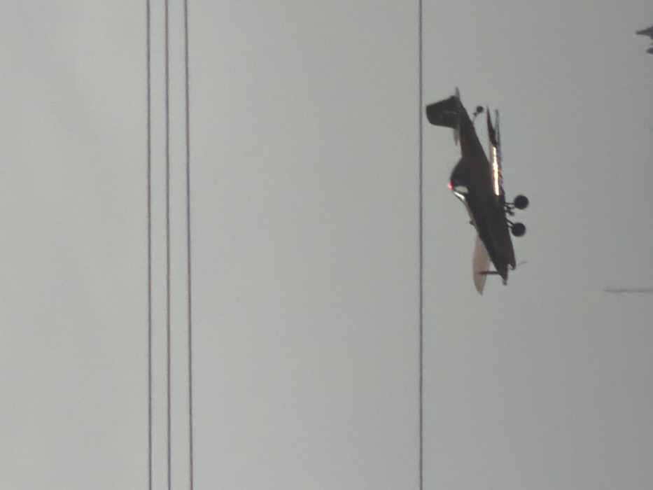 A blurry, medium shot features a biplane in the sky. It's dark, possibly black, with its wings angled sharply. Landing gear is visible beneath. In the foreground, three vertical wires bisect the image, suggesting power lines. The sky is overcast and gray, providing a flat, nondescript backdrop. Another plane is partially visible in the distance.