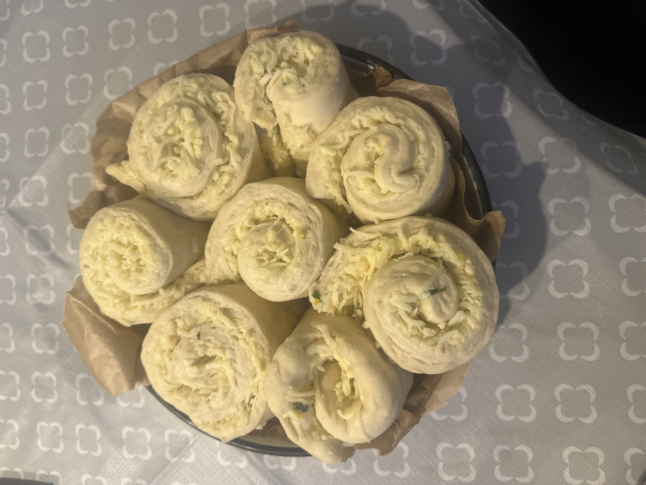 - "A top-down view depicts a dark-colored, circular baking pan filled with approximately ten unbaked, spiral-shaped dough rolls" by FM-OKKsZ2, licensed under CC BY 4.0