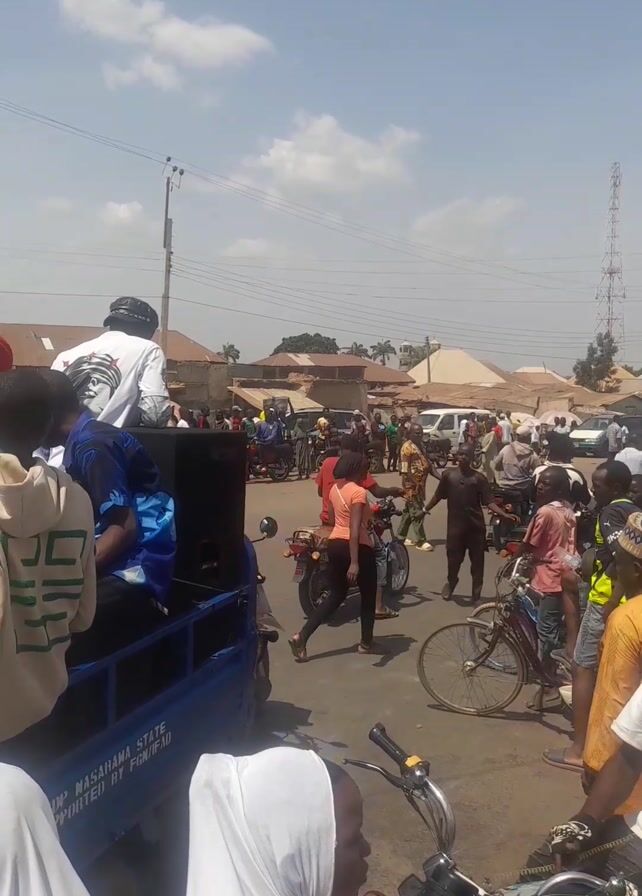 The video depicts a crowded street scene in what appears to be a town or village, under a partly cloudy sky. People are on foot, on motorcycles, and in a blue three-wheeled vehicle. The vehicle is carrying multiple passengers who are looking in different directions. There are buildings on either side of the street, and an electrical tower is visible in the background. Some of the people are wearing traditional clothing, and the scene seems busy.
