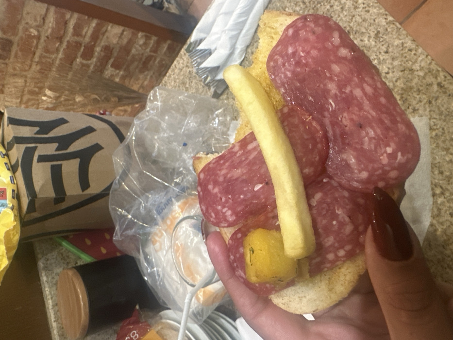 The image depicts an indoor scene in Sofia, Bulgaria, likely a casual eatery or a home kitchen, based on visible Bulgarian text on packaging. A human hand, with medium skin tone and long, dark red manicured fingernails, holds an open-faced food item in the foreground. This item consists of a piece of toasted bread topped with multiple slices of pink cured salami, a small, textured yellow block (possibly fried polenta or cheese), and a single elongated yellow french fry. In the background, a light brown speckled countertop is cluttered with various objects. To the left, a stack of white plates and a dark brown cylindrical container with a wooden lid are visible. Partially obscured by the food item is a transparent plastic bag containing several white bread rolls, with text in Cyrillic script (including "Българско" - Bulgarian) visible on the packaging within. A clear glass or cup and a white plastic utensil are also present near the bag. To the right, a large brown paper bag with a prominent black stylized logo stands upright against a red brick wall. A decorative bundle of dried wheat or similar stalks is positioned in the corner. Adjacent to the paper bag, a stack of white paper napkins and individually wrapped plastic cutlery are arranged on the countertop. No direct interactions between individuals are visible.