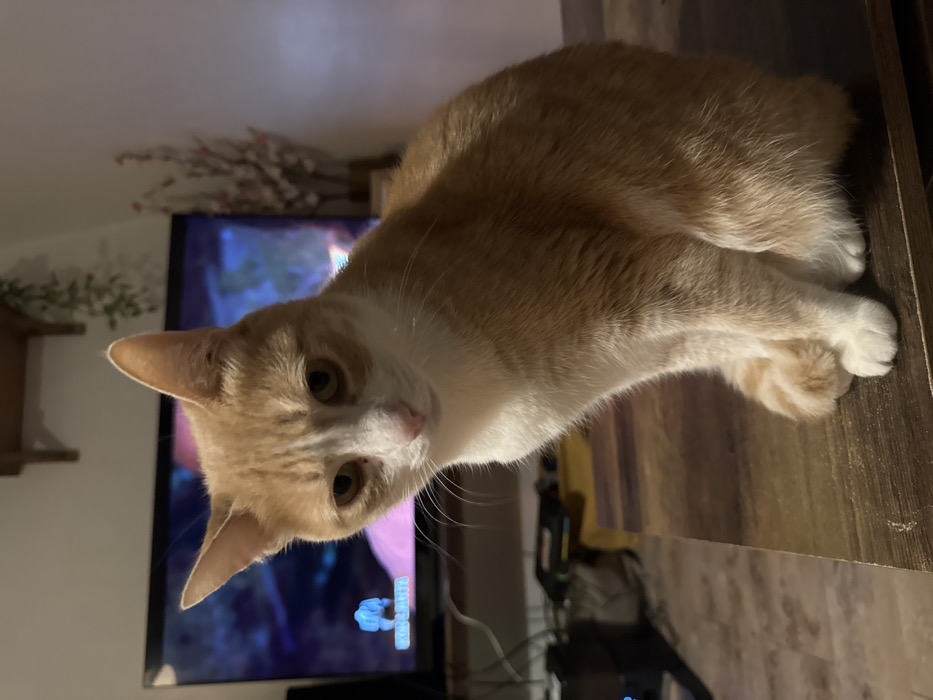 - "An orange and white domestic cat is positioned centrally on a dark brown, textured wooden surface, facing slightly to the viewer's left" by FM-xTDQG2, licensed under CC BY 4.0