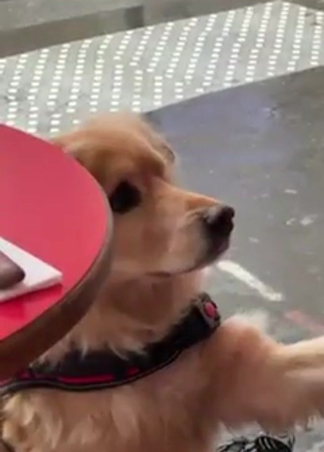 golden retriever sitting at an outdoor cafe table. The dog wears a black harness with red trim and has its paw resting gently on the table next to another person. The table is red and set with cutlery. The cafe has red and white woven chairs. Outside the cafe, there are bicycles parked along the curb and people can be seen inside the cafe. The street appears wet from rain. The video is shot from inside the cafe, looking out through a window.