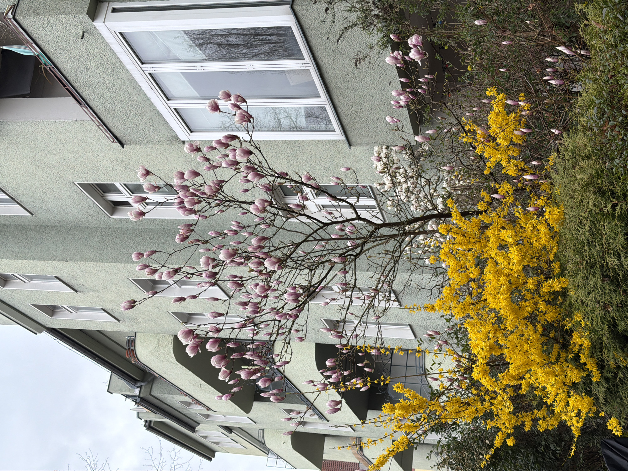 The image depicts a residential building in Berlin, Germany, likely in the spring season. The building is a pale green color with white-framed windows. Several trees in bloom are visible, including a magnolia tree with pink and white flowers and a forsythia bush with bright yellow flowers. The sky is overcast, suggesting a cloudy day. No people are visible in the frame.