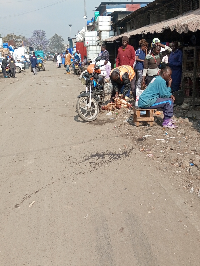The image depicts a bustling street scene in a market area of Nairobi, Kenya, characterized by active commerce and pedestrian traffic under clear daylight conditions. In the immediate foreground, a grey asphalt road exhibits scattered debris and multiple dark liquid splatters, consistent with blood. A black and silver motorcycle with an orange front cowl is parked on the road's edge, facing left. To its right, on a dirt and debris-strewn shoulder, a male individual wearing an orange reflective vest and dark trousers is bent over, actively processing raw poultry carcasses arranged on the ground. Several decapitated and plucked chickens are visible. Adjacent to this activity, a person with braided hair, dressed in a teal long-sleeved top and dark track pants, sits on a small wooden stool, observing the scene. Behind the poultry processor, a group of approximately five adults stands and observes. This group includes a man in a red jacket, another in a blue work suit, and a woman with her hand on her head. Further back, market stalls with corrugated iron roofs line the right side of the street. Behind these stalls, numerous white intermediate bulk containers (IBCs) are stacked. The street extends into the mid-ground, where more pedestrians and motorcycles are visible. Buildings of varying heights and construction materials, including red corrugated metal, define the background. A tree with purple blossoms, indicative of a Jacaranda, is prominent in the mid-background. Overhead wires are visible against a hazy, light blue sky. The overall environment suggests a busy, utilitarian urban commercial zone.