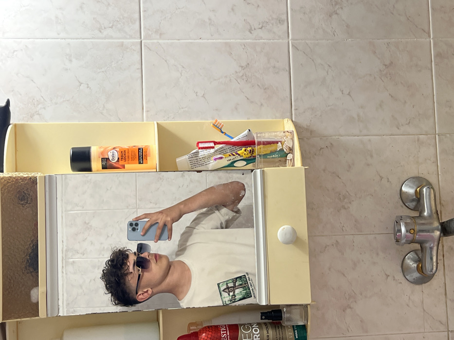 The scene depicts a domestic bathroom located in Krivodol, Bulgaria. A young male subject with dark, curly hair and wearing dark-rimmed sunglasses is visible in the reflection of a mirrored wall cabinet, actively taking a self-portrait using a light-colored smartphone held in his right hand. He is dressed in a light-colored t-shirt featuring a graphic design on the left side. The wall is covered with light-toned, square ceramic tiles exhibiting a subtle marbled pattern. Below the mirrored cabinet, a chrome-plated faucet with two gold-accented control knobs is mounted on the tiled surface. The mirrored cabinet itself is light beige. To the right of the mirror, an open section of the cabinet displays various items: on the upper shelf, an orange and black bottle labeled "Balea Traum Locken Pflege Cream"; on a lower shelf, a clear glass contains a tube of toothpaste, three toothbrushes (one red, one yellow with a character, and one blue/orange), and several small seashells. To the left of the mirror, partially visible items include a white bottle, a red and black bottle of "PRESTIGE IRON" hair product, and a small clear spray bottle.