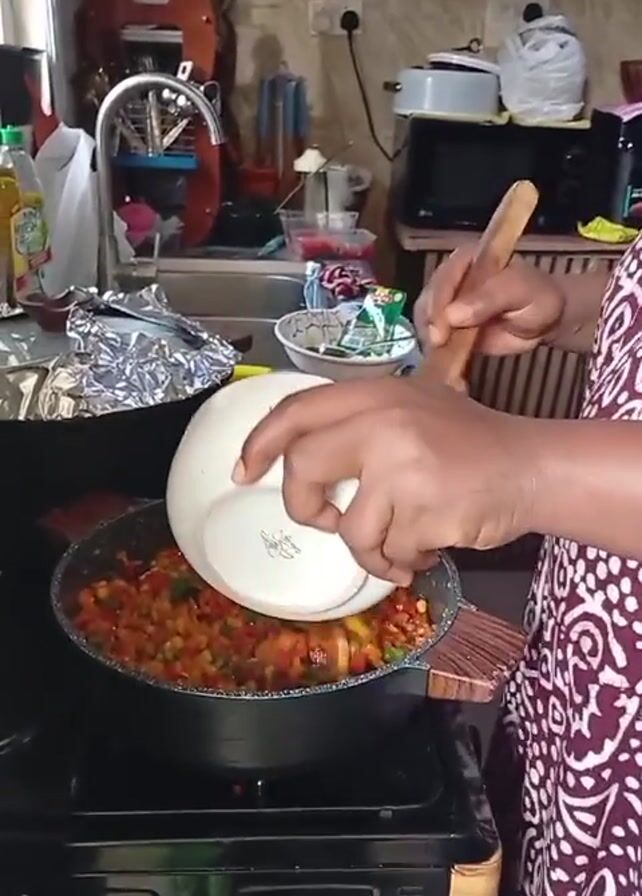 A person is in a kitchen, adding the contents of a white bowl into a black frying pan on a black stovetop. The pan appears to already contain sauteed vegetables. The person is wearing a dark patterned long-sleeved shirt. The kitchen has a stainless steel sink, faucet, and drying rack, as well as a counter with cooking oil and other items. A microwave and other appliances are in the background. The person is holding a wooden spoon in their other hand. The white bowl contains dark chopped items that are being added to the pan.