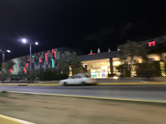 At night, a car drives past buildings decorated with festive lights. The building on the left has a blue and gray patterned facade with red and green L-shaped lights. The building on the right, possibly a hotel, features white string lights on the trees and red illuminated shapes on the roof. Streetlights illuminate the scene. A yellow curb separates the road from a grassy area in the foreground. The photo is slightly blurred, indicating movement.