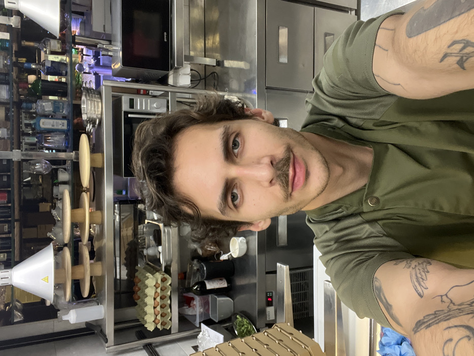 A man with dark curly hair and a mustache poses in a restaurant kitchen. He wears an olive green uniform, revealing tattooed arms. Behind him, stainless steel counters are stocked with kitchen equipment, including ovens, a microwave, egg cartons, wine bottles, and various containers. Shelves filled with liquor bottles are visible on the left. The photo's orientation is vertical, with the man occupying the right side of the frame.