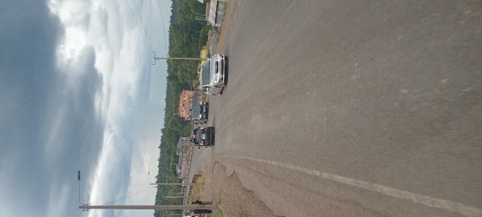A road runs diagonally across the image, showing multiple cars. A row of trees and power lines flanks the left side of the road. On the other side, a cloudy sky dominates the view. Buildings are visible behind the trees, and the road surface appears somewhat damaged.