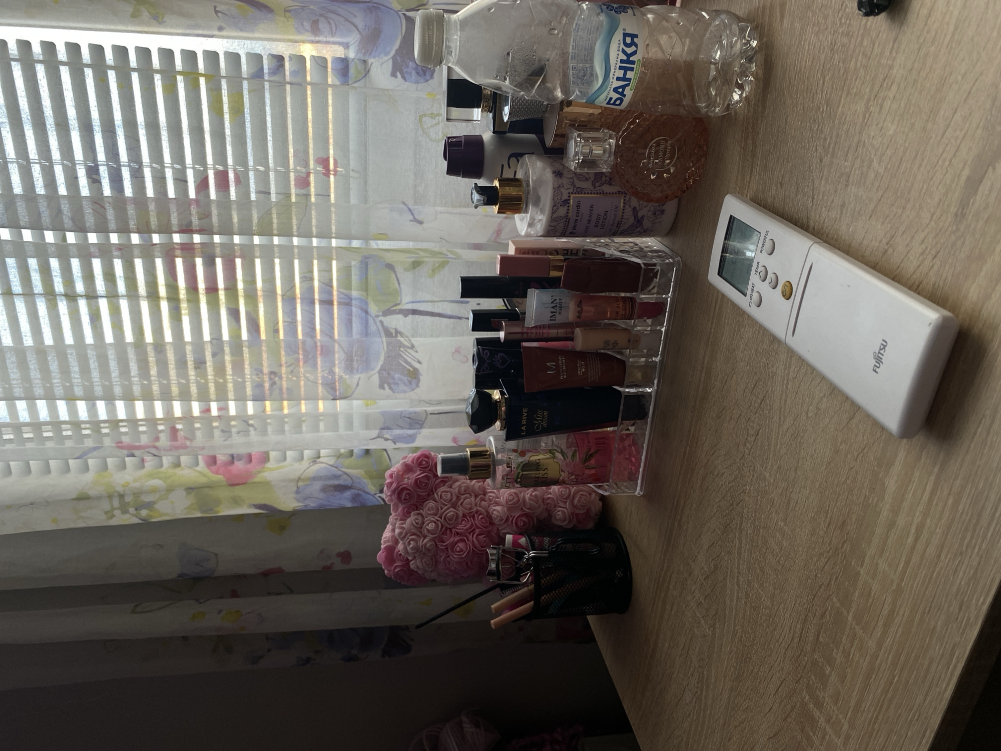 cluttered surface next to a window with blinds. The surface appears to be a desk or tabletop with a light wood grain finish. A clear plastic organizer contains various makeup items, including lipsticks, concealers, and perfume bottles with brands such as La Rive and Pierre Cardin visible. There is also a water bottle labelled "Bankia" in Bulgarian Cyrillic. A small floral arrangement of artificial pink roses sits near the organizer, next to a black wire mesh pen holder. A white Fujitsu remote control rests on the surface. The blinds are partially closed, revealing a floral patterned curtain underneath. The overall scene suggests a personal space such as a bedroom or bathroom. Bankya water is a common mineral water brand in Bulgaria. The image location appears to be in Bulgaria, but the city is not definitively identifiable as Blagoevgrad.