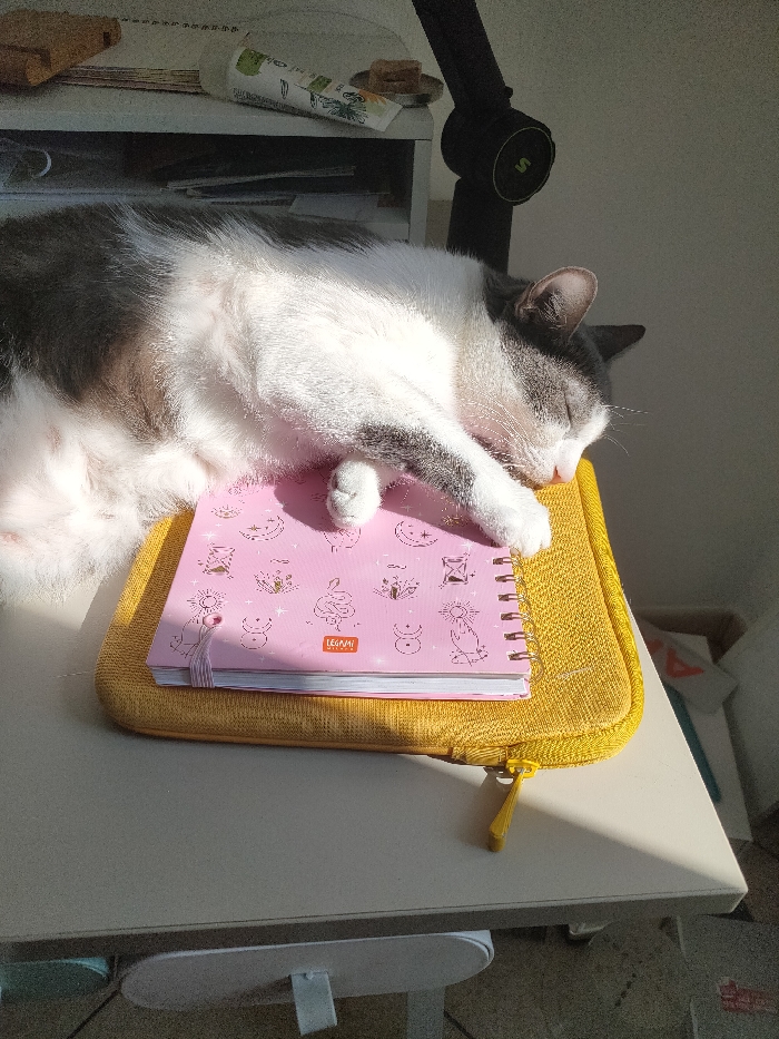 The image depicts an indoor scene in Schiltigheim, France, captured from a slightly elevated perspective. A domestic cat, predominantly white with grey patches on its back, head, and tail, is observed sleeping on a light-colored desk. The cat is positioned on a pink spiral-bound notebook, which rests on a textured yellow zippered pouch. The notebook's cover features various mystical-themed illustrations and the brand name "LEGAMI." The cat's head is turned to the right, eyes closed, and its front paws are resting on the notebook. Bright natural light illuminates the scene from the left, casting a distinct shadow of the cat and objects onto the desk surface. In the background, a white shelf unit is partially visible, holding a small wooden item, a white cylindrical object with green markings, and a small dish containing what appear to be brown biscuits or small snacks. A black articulated desk lamp arm with a green "S" logo is visible to the upper right. A portion of a white chair or furniture element is visible beneath the desk. The wall behind the desk is light-colored and unadorned.