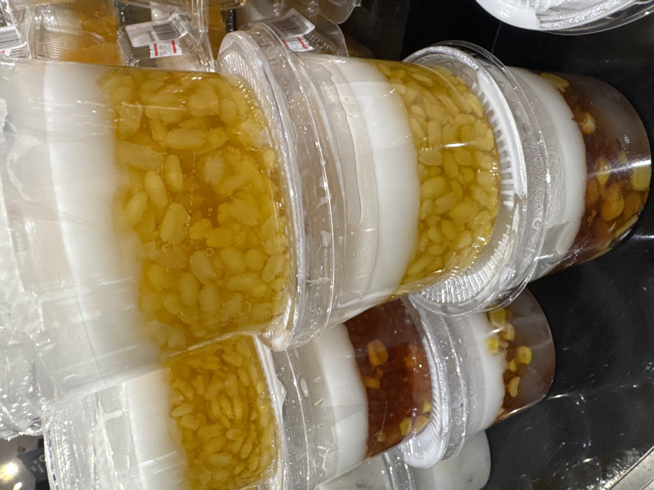 The image displays a close-up of multiple clear plastic cups containing layered desserts, observed in Wichit, Thailand. The cups are arranged in stacks of two or three high, forming a row on a dark, reflective surface. Each cup holds a dessert with an opaque white creamy layer at the top, a translucent yellow syrupy layer with numerous oblong yellow pieces in the middle, and in some instances, a translucent reddish-brown layer containing small light-colored components at the bottom. All cups are sealed with clear plastic lids. The background features blurred retail packaging with discernible labels and barcodes, indicating a commercial setting such as a grocery store or market. No individuals or active interactions are present.