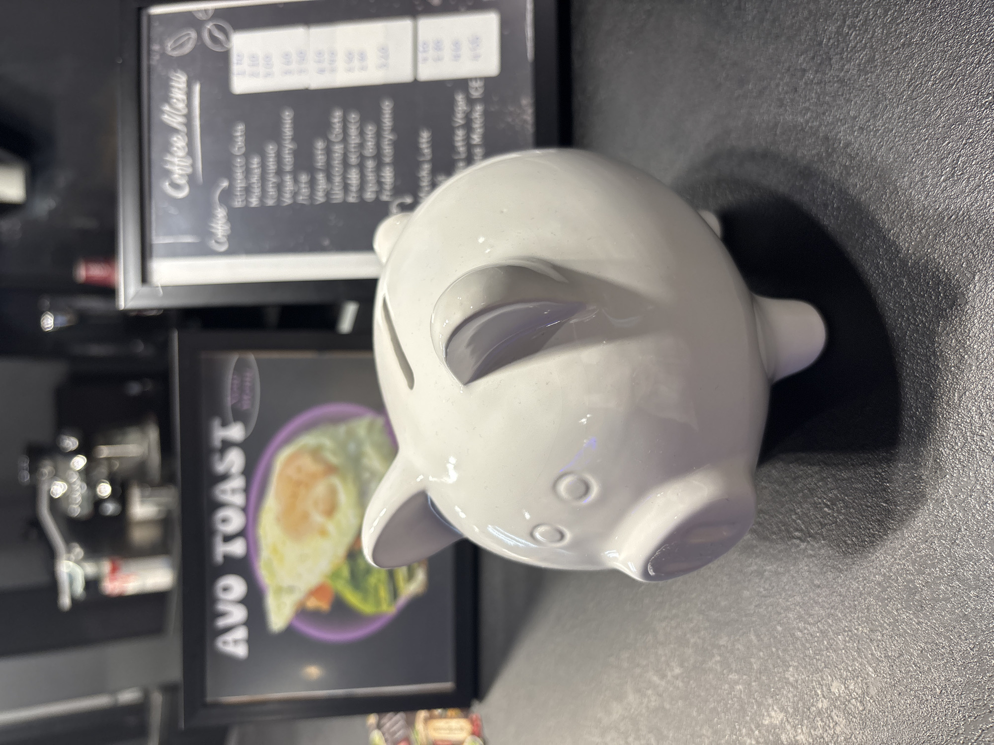 A close-up photograph depicts a white ceramic piggy bank resting on a gray textured surface. Behind the piggy bank, there's a menu board displaying coffee selections, including macchiato and cappuccino in both standard and vegan variations, along with other beverages like "Shokolad Svete" and "Frappe Bulo." Further behind is a black framed poster with the words "AVO TOAST". In the blurred background to the left, coffee shop equipment is partially visible. The image's location is suggested to be in Sofia, Bulgaria, based on the Cyrillic alphabet used in the menu items.