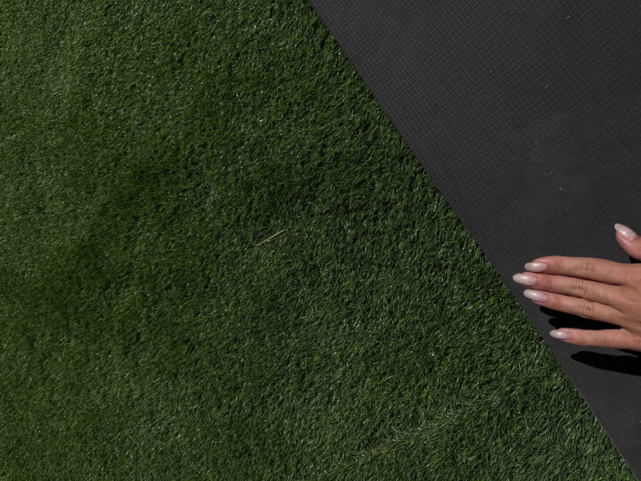 - "The image displays an overhead view split diagonally between a black textured mat and green artificial turf, illuminated by direct sunlight" by FM-8hjXn1, licensed under CC BY 4.0
