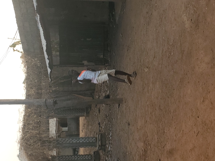 The scene is an unpaved, reddish-brown dirt street or open area in Akwanga, Nigeria. A dark-skinned individual, appearing male, stands in the center foreground, facing slightly left of the camera. He wears a white short-sleeved t-shirt with orange and white details on the chest, light-colored shorts, and open-toed sandals. His hands are slightly raised, and his gaze is directed towards the viewer. To the left of the individual, a tall, dark utility pole stands in the mid-ground. Further left and behind, several decorative concrete pillars with segmented, cylindrical designs are visible, leading towards a partially visible building with a light-colored roof. Overhanging structures in the background are covered with dense, dry, interwoven vegetation. To the right of the individual, a small, dark structure with a corrugated metal roof and a prominent dark metal door or gate is present. Behind this structure and extending across the upper right background is a light-colored concrete wall, above which thin power lines are visible against a bright, hazy sky. The overall environment suggests a residential or semi-urban setting with unpaved roads and basic infrastructure.
